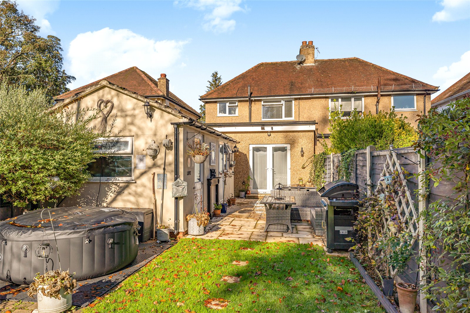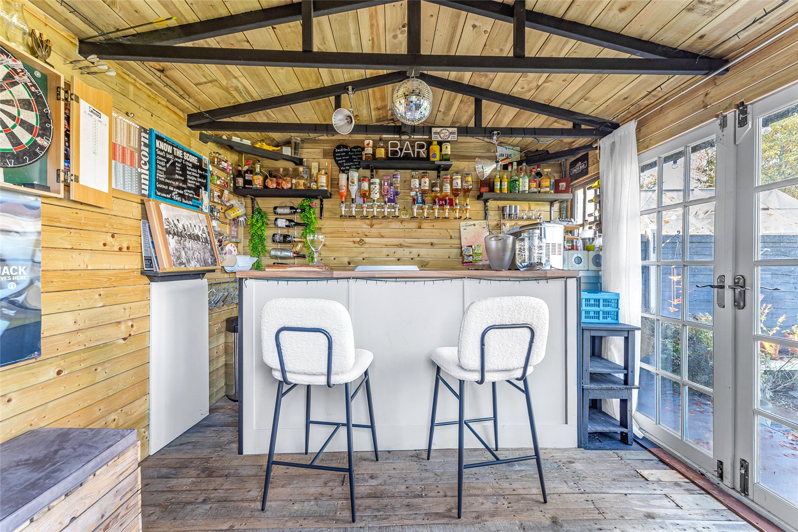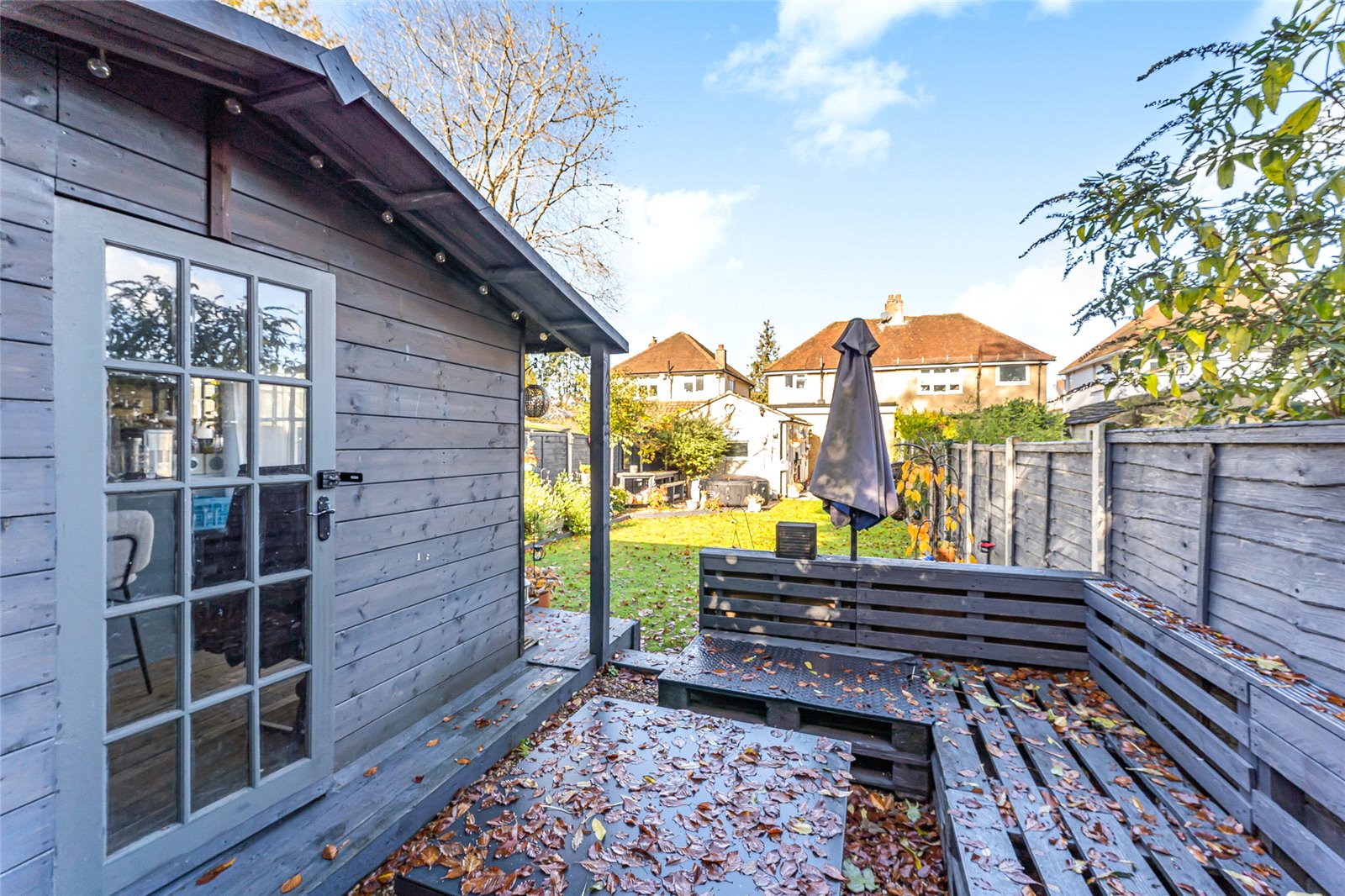 Externally, the property boasts off-street parking for multiple vehicles, complemented by a garage equipped with electrics, which has been partially converted into a home office—perfect for remote working or hobbies. The large rear garden features a well-maintained lawn and patio area, ideal for outdoor dining and family gatherings. At the end of the garden sits a detached summer house/studio, complete with lighting and electrics, offering a versatile space for use as a bar, gym, or creative studio.