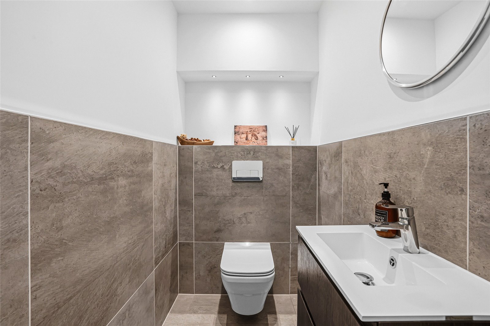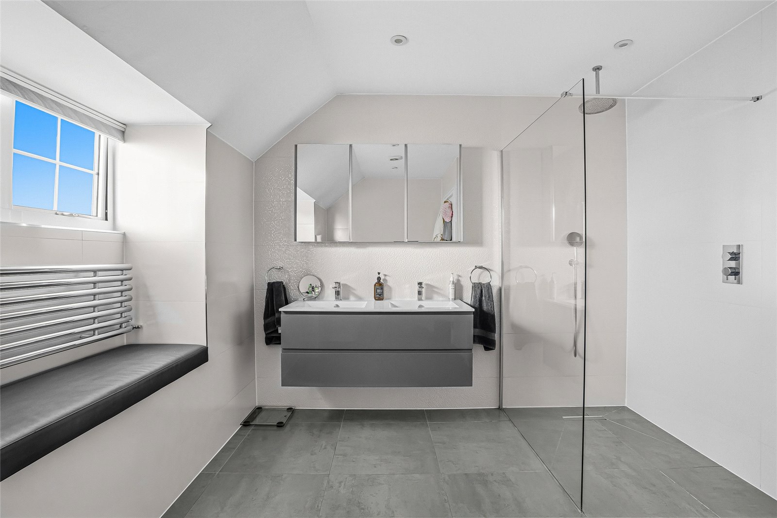 The first floor offers a spacious landing, currently utilised as a study area. The principal bedroom is beautifully presented in neutral tones and benefits from bespoke fitted wardrobes providing excellent storage. The en-suite shower room features a walk-in shower, his and hers basins, a low-level WC, and is fully tiled to both walls and floor. There are three further well-proportioned bedrooms on this floor, all served by a generous family bathroom.
