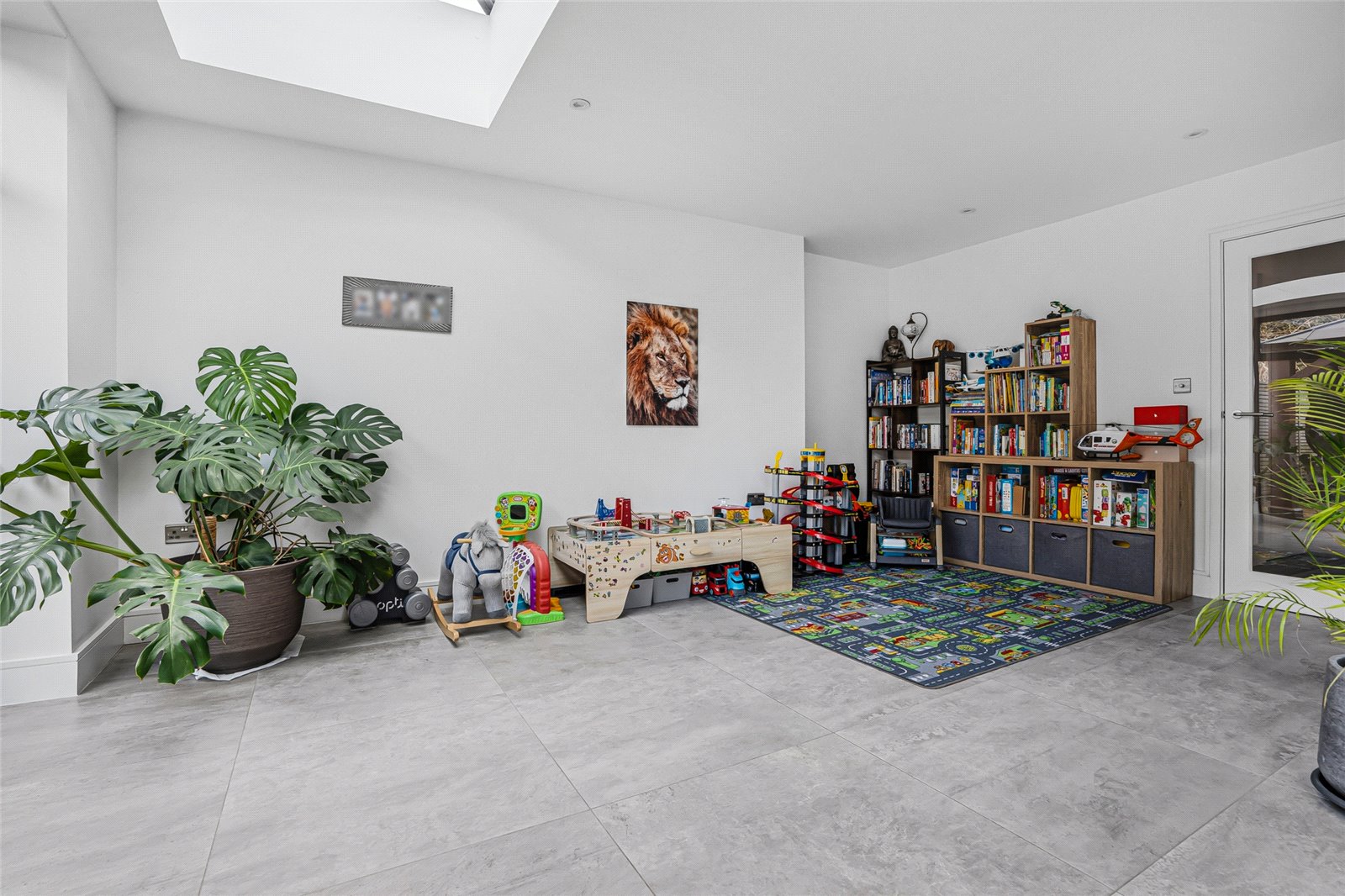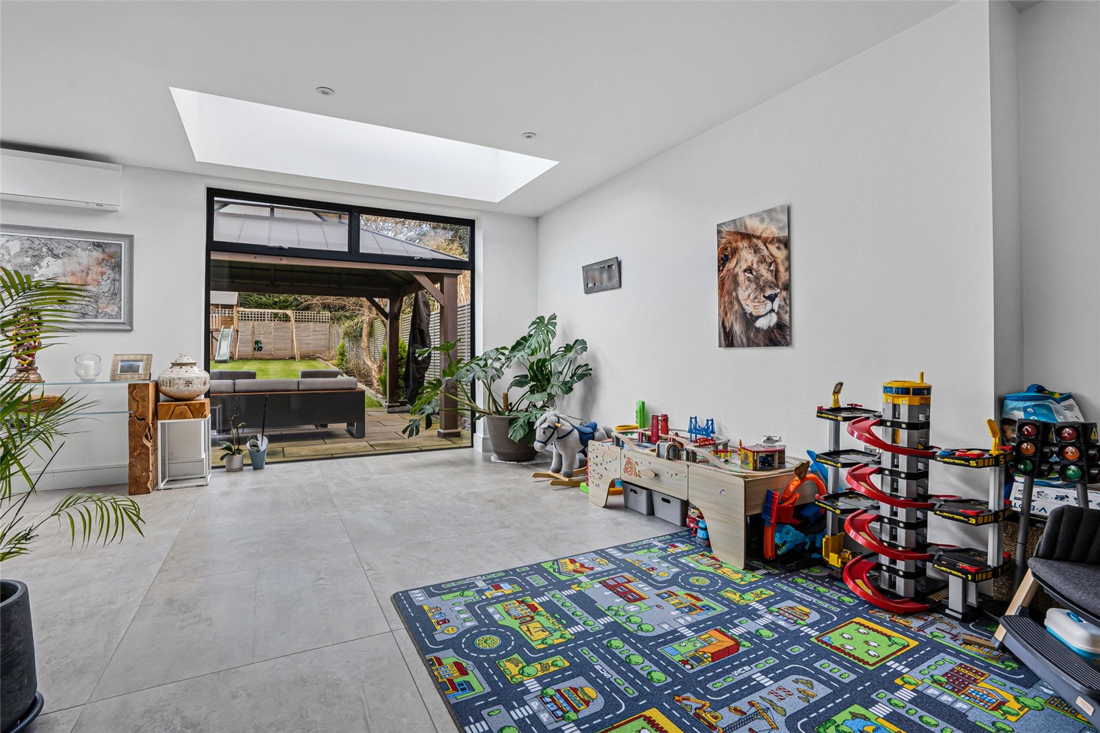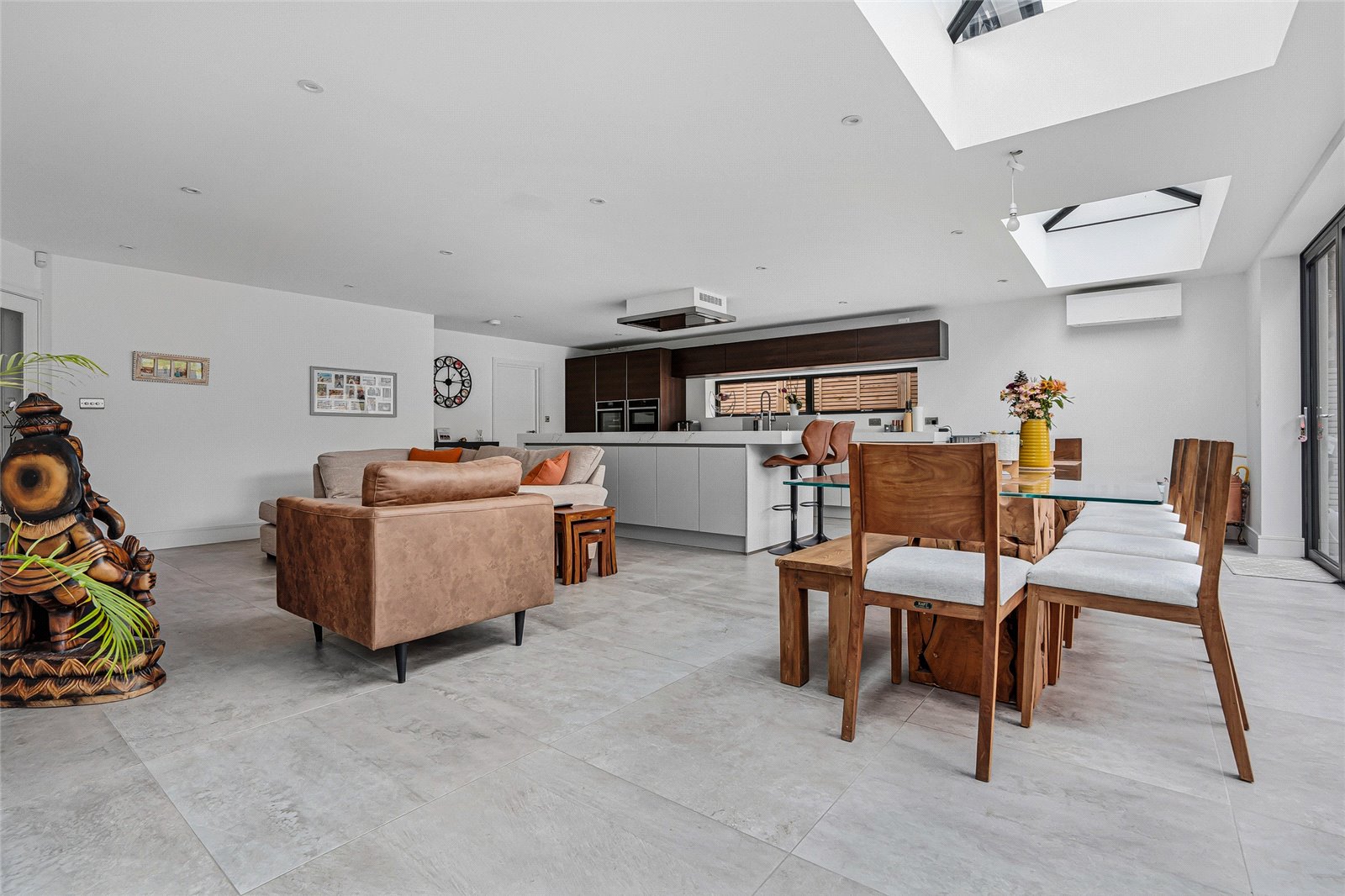 The rear of the property is occupied by an impressive open-plan kitchen, dining, and family space spanning the full width of the house. Bi-folding doors open directly onto the landscaped garden, while three roof lanterns flood the room with natural light. This versatile space could, if desired, be divided to create separate reception areas.