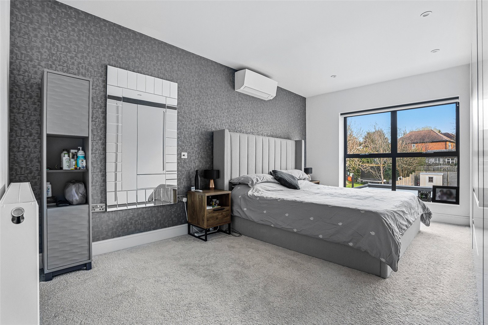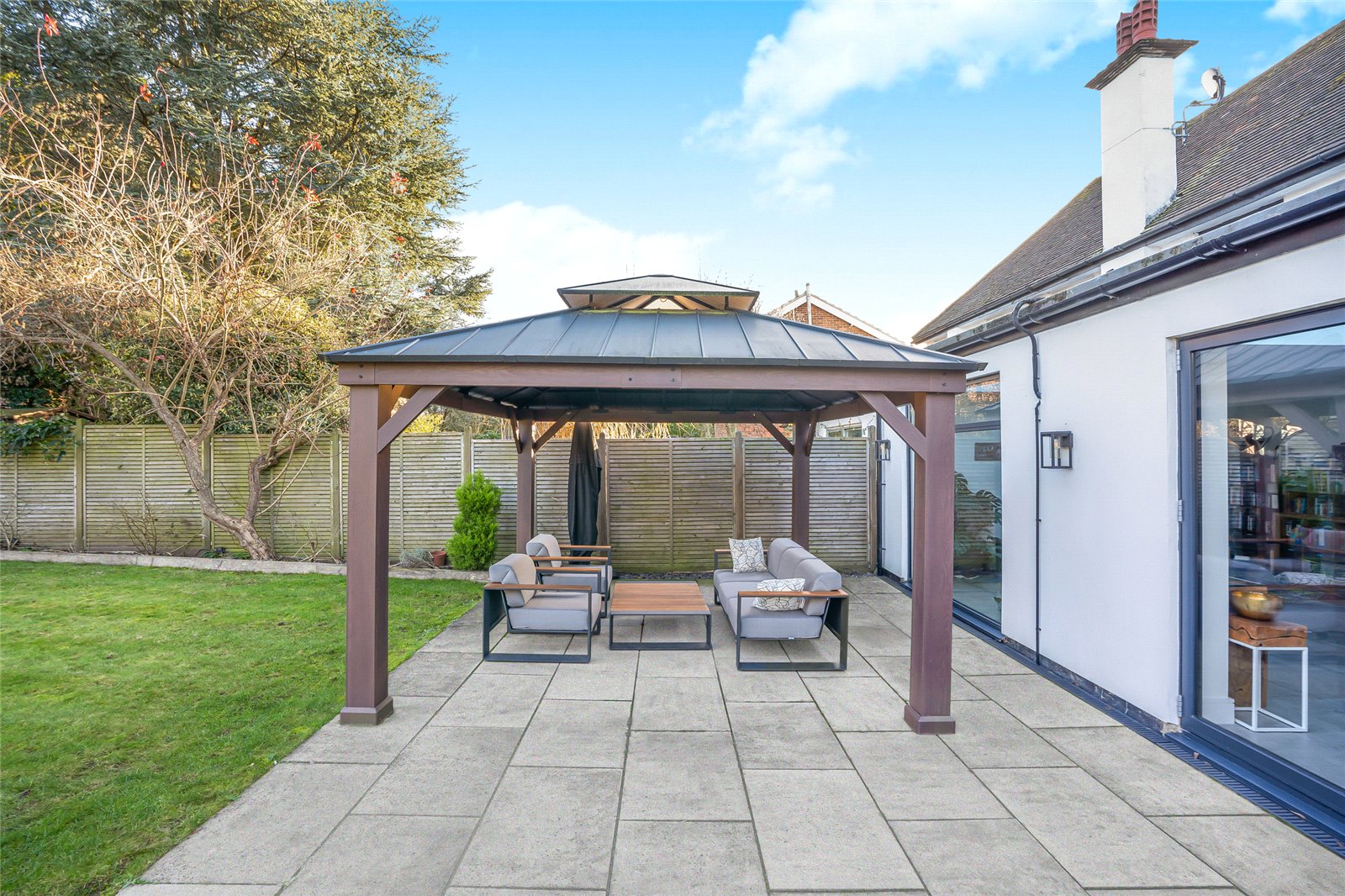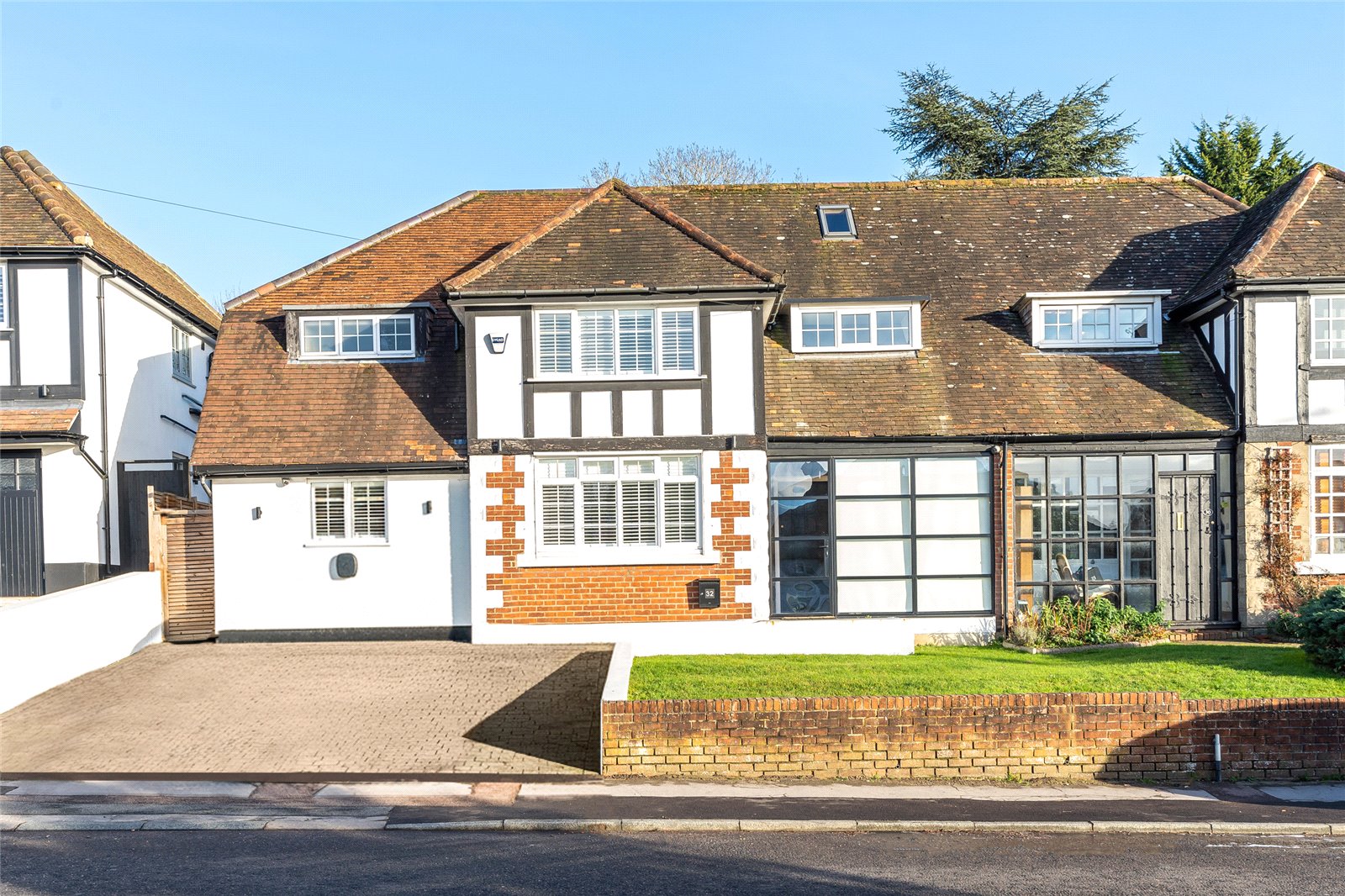 Externally, the property enjoys a large, private rear garden that is fully enclosed and predominantly laid to lawn, complemented by two substantial paved terrace areas to the front and rear—ideal for entertaining. To the front of the property, there is gated side access, off-street parking for several vehicles with an EV charger, and a raised lawned area.