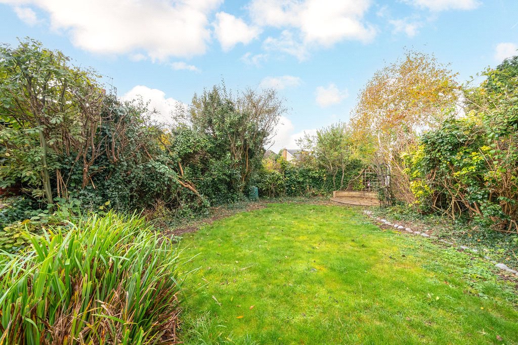 - Mature rear garden with wisteria-covered pergola