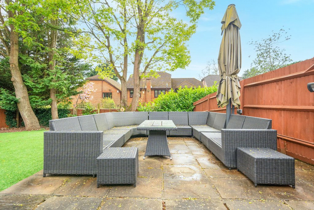 The south facing rear garden is a tranquil and private space with a generous patio, manicured lawn, mature trees, and thoughtful landscaping. Discreet uplighters at the base of the trees provide ambient evening lighting, and external power makes it easy to entertain outdoors or add lighting features.